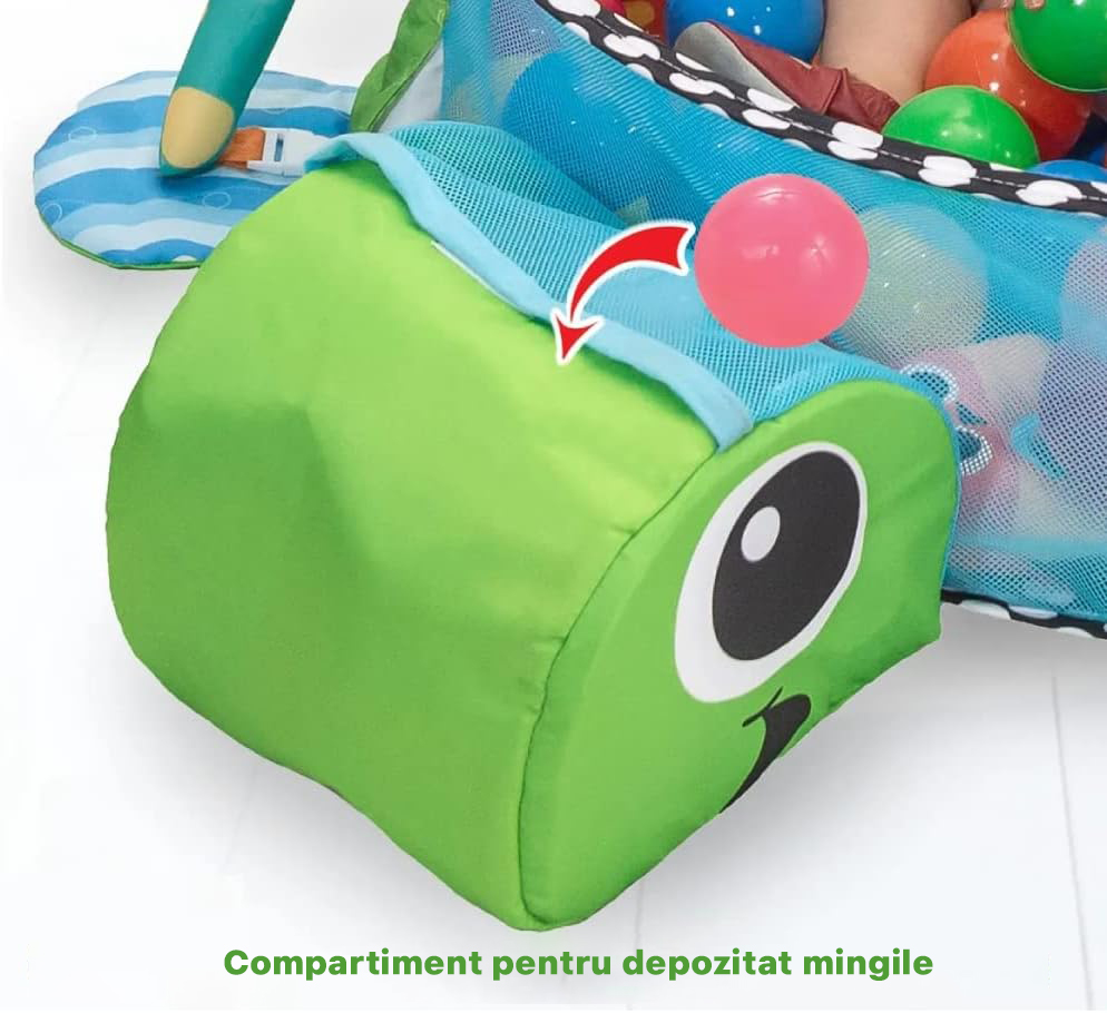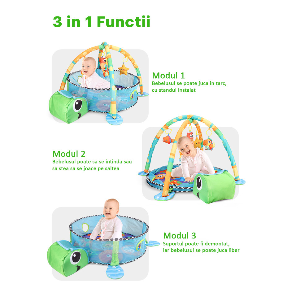 Centru de activitati 3 in 1 si Saltea de joaca pentru copii si Bebelusi, 5 jucarii interactive detasabile ,piscina cu 20 de bile Multicolore , Capison de depozitare bile, model BroascaTestoasa/ursulet, educativ, distractiv si colorat