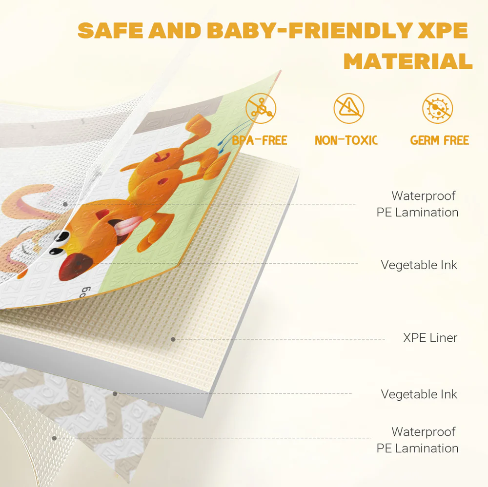 MATERIAL XPE SIGUR - Covorasul nostru pentru bebelusi este fabricat din material spuma XPE de inalta densitate, non-toxic, inodor si nu se rupe usor. Ofera o suprafata de joaca moale si sigura pentru copii mici si sugari. Covorase de joaca excelente pentru sugari, de la nou-nascuti la copii mici. Textura antiderapanta pentru a preveni alunecarea usoara a bebelusului atunci cand invata sa mearga. Covorasul este potrivit pentru toate podelele dure si poate oferi o amortizare suficienta, in special atunci cand bebelusii cad.